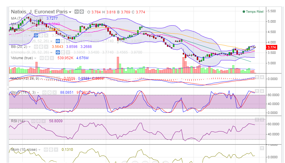 D’un point de vue graphique, on évoluait encore la semaine dernière dans une figure de biseau descendant, figure chartiste que j’affectionne puisque cette figure est cassée très souvent par le haut. Le signal d’achat de l’action Natixis a été donné par la cassure par le haut de la résistance oblique baissière (ROB) à 3.40 €.