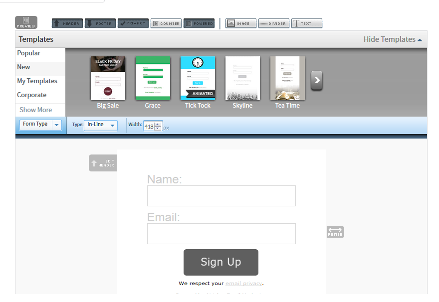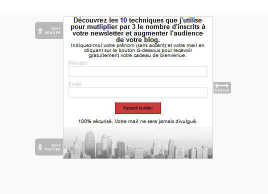 Concevez votre formulaire en décrivant précisément la headline (bandeau supérieur du formulaire) en attirant l’attention de vos visiteurs et en leur spécifiant ce qu’ils vont obtenir en échange de leur mail (e-book gratuit, vidéo gratuite ou podcast gratuit). Utilisez également un template (corps du formulaire) le plus esthétique possible et en relation avec votre thématique.