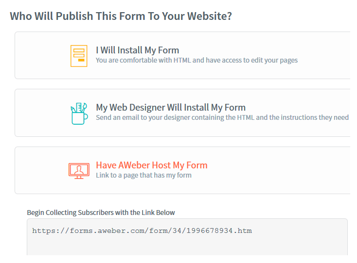 Enfin, choisissez l’option « have Aweber host your form » pour obtenir le lien final de votre formulaire.