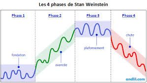 Le cours oscille de nouveau entre deux bornes (un peu comme en phase 1). Les volumes seront en général importants dans cette phase et la volatilité grande, la MM30 hebdo qui était ascendante en phase 2 commence à s’aplatir, il arrive que l’action reparte en phase 2 de hausse mais cela reste rare;