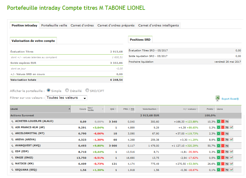 Voici un article concernant mon portefeuille boursier au 13 mai 2017.