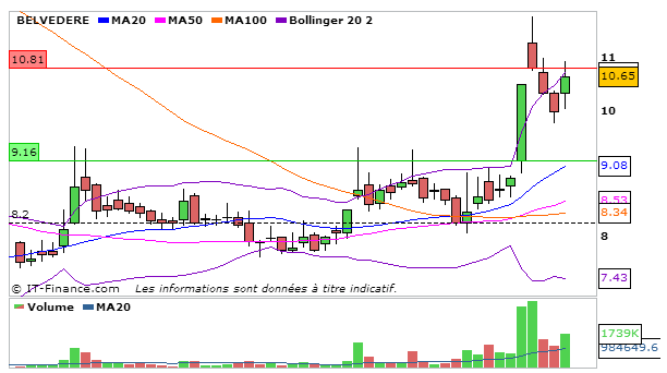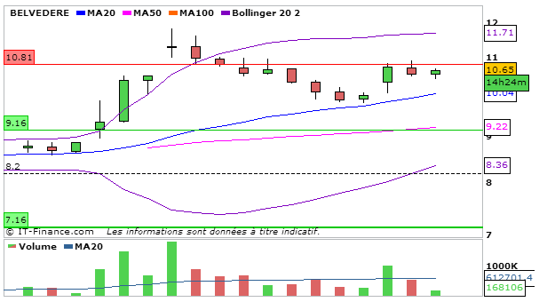 Concernant Belvédère, grosse hausse de plus de 6% aujourd’hui. En UT journalière, la MACD poursuit sa hausse par rapport à la séance d’hier à 0,55 et évolue au dessus de sa ligne de signal. La Stochastique repart à la baisse en dessous de sa ligne de signal à 59,98. Graphiquement on termine juste au dessus de la bande supérieure de bollinger. L’ADX repart à la hausse à 39,11 ce qui signifie que la tendance haussière reste intacte. Attention à la volatilité qui s’est agrandie…Je reste extrêmement positif sur la valeur mais je n’exclus pas à court terme une nouvelle consolidation jusqu’à la MM20. Cependant une poursuite de la hausse n’est pas à exclure demain car on valide un point bas à court terme qui validerait une prochaine hausse…