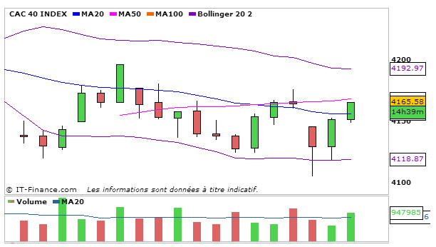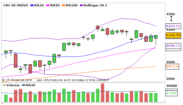 Après un rallye baissier de l’indice parisien, celui-ci termine finalement quasiment à l’équilibre à 4165,58 points.