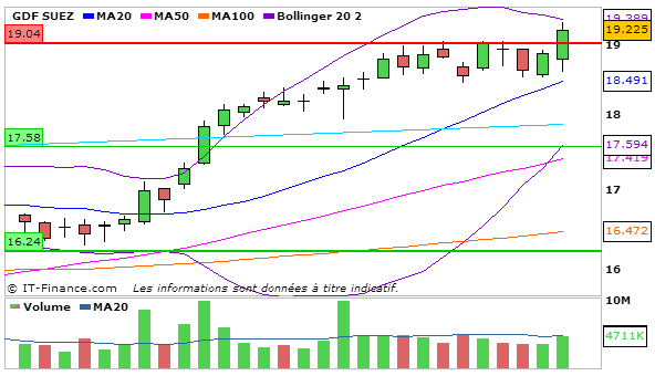 Concernant GDF, En UT journalière, la MACD croît légèrement et en se confondant avec sa ligne de signal (0,509) et la stochastique croît légèrement en dessous de sa ligne de signal à 79,68. Le cours termine tout juste en dessous la bande supérieure de bollinger. L’ADX croît légèrement à 30,4.