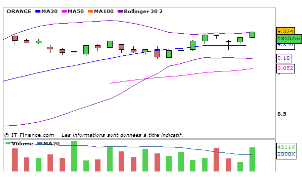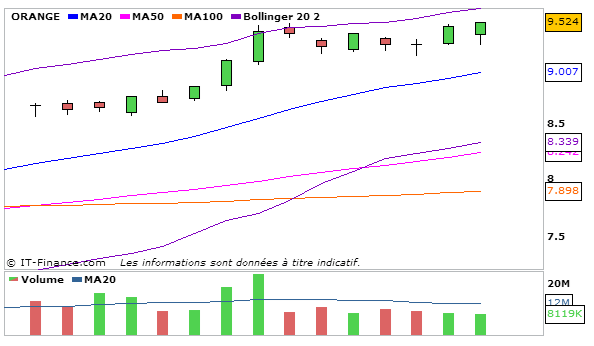 Concernant Orange, En UT journalière, la MACD est en légère augmentation au dessus de sa ligne de signal à 0,357 et la stochastique repart violemment à la hausse à 91,29 au dessus de sa ligne de signal. Graphiquement le cours évolue en trade range entre la bande supérieure de bollinger et la MM20. L’ADX reste haussier à 52,55 ce qui traduit que la nouvelle tendance haussière est forte! Une figure en W ou tasse avec anse est en train de se mettre en place.