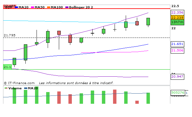 En UT 4 heures, la MACD est croissante en s’éloignant de sa ligne de signal (0,193). La Stochastique est toujours élevée sa ligne de signal (88,66). Graphiquement, le titre vient de quitter la bande supérieure de bollinger pour rejoindre la MM20. La MM20 a coupé la MM50 à la hausse mais attention à la correction.