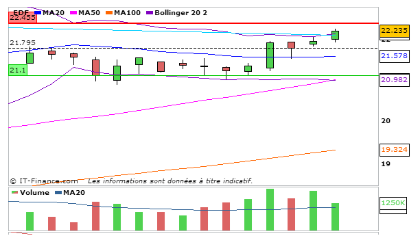 Pour EDF, en UT journalière, la MACD se redresse et a coupé à la hausse sa ligne de signal (0,222) et la stochastique reste élevée (90,02). Graphiquement, le cours termine au dessus de la bande supérieure de bollinger.