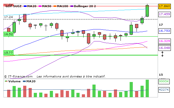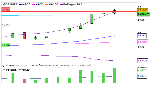 Concernant GDF, en UT journalière, la MACD se redresse a coupé à la hausse sa ligne de signal (0,218) et la stochastique est croissante à 87,99. Le cours termine au dessus de la bande supérieure de bollinger.