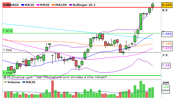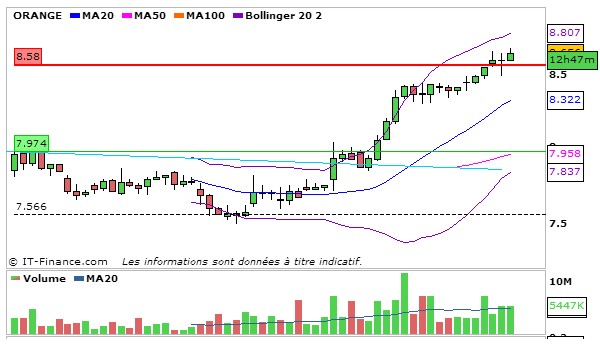 Concernant Orange, en UT journalière, la MACD est en hausse au dessus de sa ligne de signal à 0,242 et la stochastique est élevée à 97,63. Graphiquement le cours se retrouve toujours au delà de la bande supérieure de bollinger!