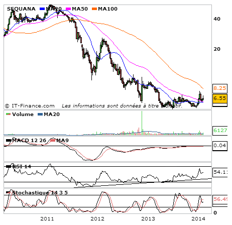 Le CAC 40 me semble bien orienté en UT hebdomadaire mais une divergence baissière cachée sur un indicateur technique me fait penser qu’il faut rester prudent pour les prochaines séances. C’est pour cela que je n’investis sur aucune action du CAC mais que je reste investis sur 2 Small & Mid Cap à savoir Sequana et Soitec, 2 titres sur lesquels je reste positif à moyen terme.