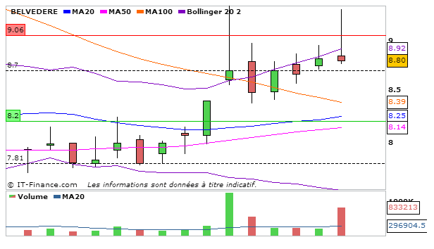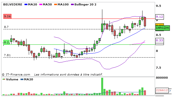 Légère consolidation concernant Belvédère, en UT journalière, la MACD aura une nouvelle fois progressé par rapport à la séance d’hier à 0,16. La Stochastique quant à elle repart à la hausse à 62,13. Graphiquement on termine juste en dessous de la bande supérieure de bollinger. Malgré la baisse du jour, il est intéressant de constater que le titre a testé les 9,34 € et que les MM20 et MM50 sont sur le point de couper à la hausse la MM100.
