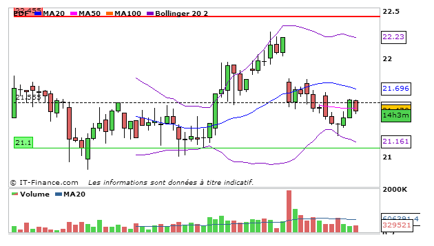 En UT 4 heures, la MACD reste stable au dessus de sa ligne de signal (0,19) et la stochastique repart à la baisse mais est plus élevée qu’hier (67,86) et va recouper à la baisse sa ligne de signal. Graphiquement, le titre termine au dessus de sa MM20.