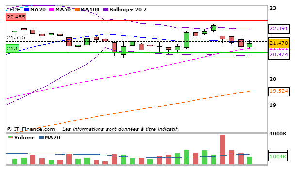 Pour EDF, en UT journalière, la MACD poursuit sa chute et a coupé à la baisse sa ligne de signal (0,112) et la stochastique chute et a coupé à la baisse sa ligne de signal (37,28). Graphiquement, le cours rebondit au dessus de la MM50. Il est donc temps pour le titre de repartir à la hausse pour rejoindre la MM20 qui est très proche.