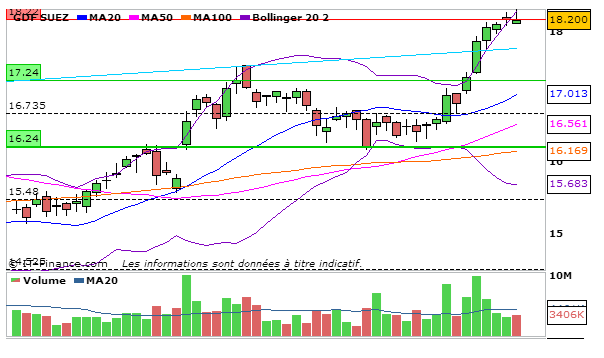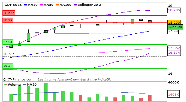 Pour GDF, en UT journalière, la MACD continue sa hausse au dessus de sa ligne de signal (0,43) et la stochastique a stoppé sa hausse par rapport à la séance d’hier à 94,45. Le cours terminejuste en dessous de la bande supérieure de bollinger.