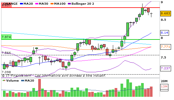Concernant Orange, en UT journalière, la MACD est en hausse au dessus de sa ligne de signal à 0,299 et la stochastique est légèrement décroissante à 83,17. Graphiquement le cours quitte progressivement la bande supérieure de bollinger en direction de la MM20 qui reste encore loin. L’ADX reste haussier ce qui traduit que la nouvelle tendance haussière est forte!