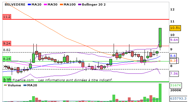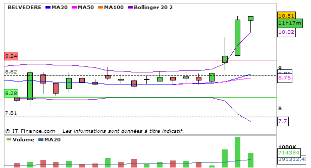 Concernant Belvédère, hausse fulgurante de plus de 18% aujourd’hui. En UT journalière, la MACD double par rapport à la séance d’hier à 0,27 et évolue au dessus de sa ligne de signal. La Stochastique repart à la hausse au dessus de sa ligne de signal à 70,85. Graphiquement on termine au dessus de la bande supérieure de bollinger. L’ADX repart à la hausse à 33,86 ce qui signifie que la tendance haussière reste intacte. L’on constate que la MM20 a coupé à la hausse la MM100, signe que le titre a un excellent potentiel de hausse et l’on devine que la MM50 va bientôt couper à la hausse la MM100! Attention à la consolidation!