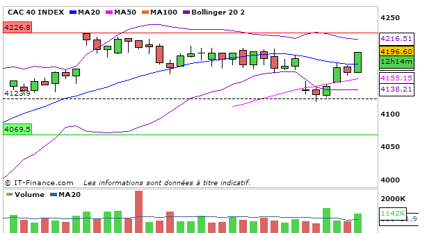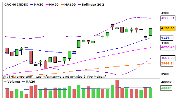 Joli rebond pour l’indice parisien aujourd’hui avec un CAC 40 qui efface les pertes d’hier en terminant à 4296,60 points.