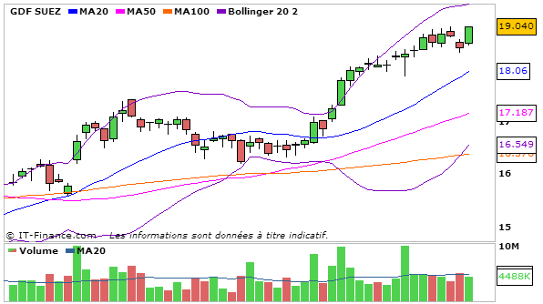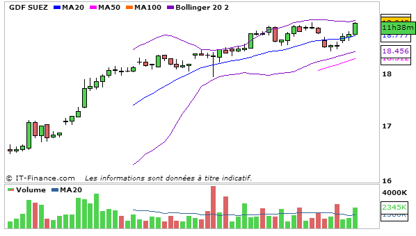 Concernant GDF, En UT journalière, la MACD repart à la hausse au dessus de sa ligne de signal (0,552) et la stochastique rebondit légèrement en dessous de sa ligne de signal à 86,87. Le cours termine entre la bande supérieure de bollinger et la MM20. L’ADX baisse légèrement à 31,22.