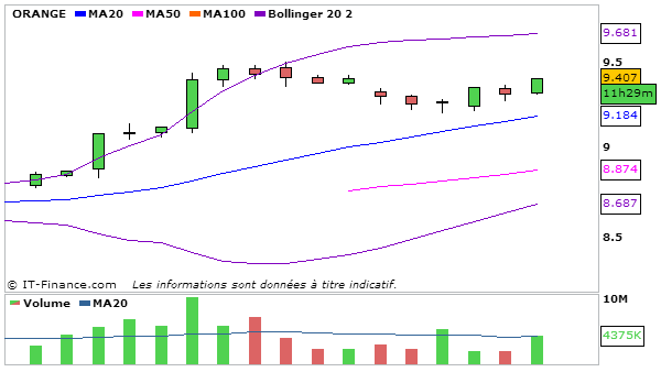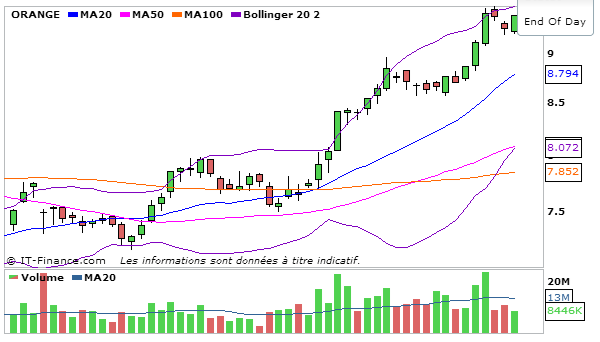 Concernant Orange, En UT journalière, la MACD est en légère hausse en rebondissant au dessus de sa ligne de signal à 0,366 et la stochastique repart légèrement à la baisse à 85,49 en dessous de sa ligne de signal. Graphiquement le cours termine juste en dessous de  la bande supérieure de bollinger. L’ADX reste haussier à 51,03 ce qui traduit que la nouvelle tendance haussière est forte!