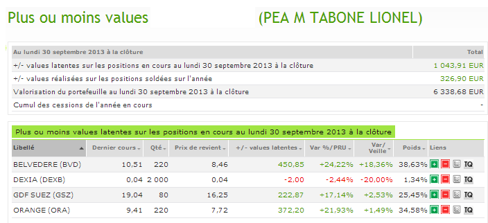 Mon portefeuille s’est très bien comporté aujourd’hui puisque ORANGE, GDF et BVD auront progressé. Mes plus values latentes atteignent environ 1043 € de plus value latente. Les plus values totales atteignent environ 1370 € soit un rendement d’environ 31 %.