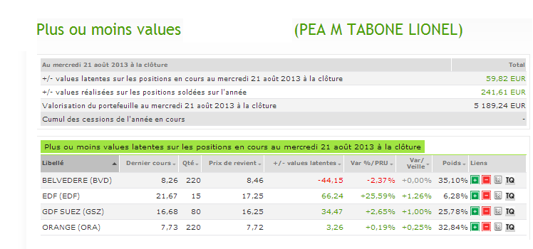 EDF est une entreprise que j’ai achetée au mois d’avril dernier (75 actions) avec un PRU de 17,25€ et dont j’ai revendu déjà les 3/4 il y a un mois lorsque mon stop de protection a été atteint (plus-value réalisée de 261 €) . Je suis néanmoins convaincu que l’entreprise peut avoir encore un objectif de cours d’environ de 25 euros auquel cas je vendrai mes 15 dernières actions!