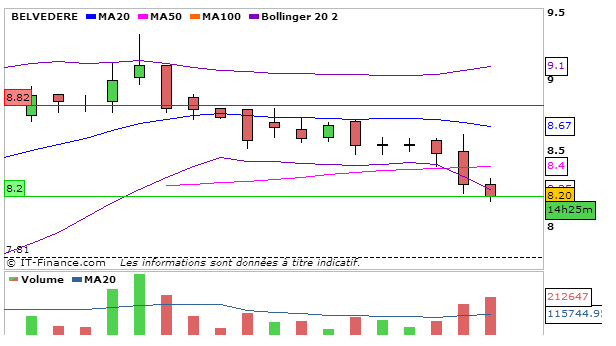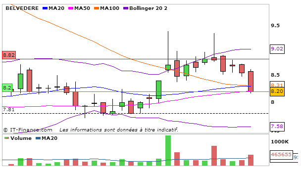 Une nouvelle forte consolidation concernant Belvédère, en UT journalière, la MACD aura chuté  par rapport à la séance de vendredi à 0,11 et va couper à la baisse sa ligne de signal. La Stochastique chute aussi à la baisse à 43,01. Graphiquement on termine en dessous de la MM20 et de la MM100 mais au dessus de la MM50. L’ADX stagnet à 30,99 ce qui signifie que la tendance haussière reste intacte. L’on constate que la MM20 va couper à la hausse la MM100, signe que le titre a un excellent potentiel de hausse.