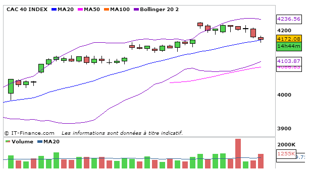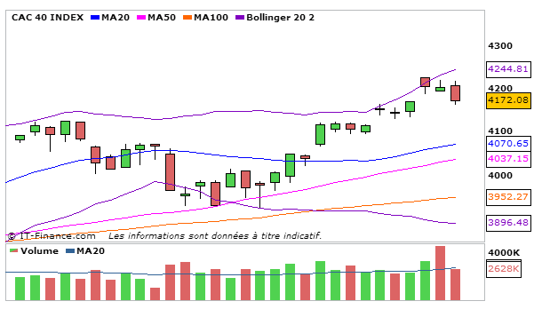 Très forte baisse de l’indice parisien de 0,75% par rapport à la séance de vendredi à 4172,08 points.