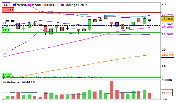 Pour EDF, en UT journalière, la MACD repart à la hausse même si elle est toujours sous sa ligne de signal (0,154) et la stochastique repart à la hausse et coupe à la hausse sa ligne de signal (70,85). Graphiquement, le cours termine au dessus de la MM20.