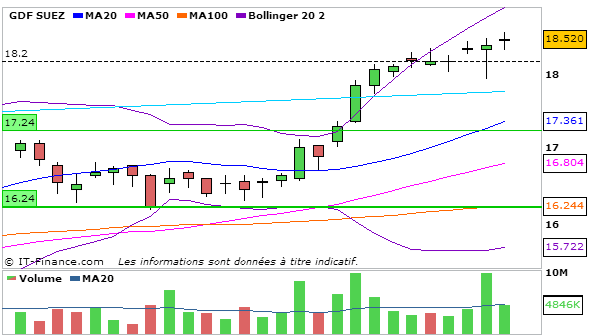 Pour GDF, en UT journalière, la MACD continue sa hausse au dessus de sa ligne de signal (0,514) et la stochastique continue de croître à 95,34 même si elle se confond avec sa ligne de signal. Le cours termine juste en dessous de la bande supérieure de bollinger. L’ADX commence croît légèrement à 28,93.