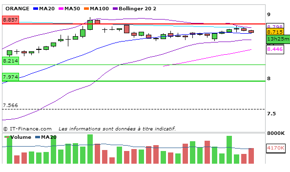 Concernant Orange, en UT journalière, la MACD est en légère baisse au dessus de sa ligne de signal à 0,274 et la stochastique repart légèrement à la hausse à 79,32 prête à recouper sa ligne de signal à la hausse. Graphiquement le cours quitte progressivement la bande supérieure de bollinger en direction de la MM20 qui reste encore loin. L’ADX reste haussier à 42,85 ce qui traduit que la nouvelle tendance haussière est forte!