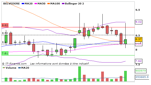Une nouvelle hausse concernant Belvédère, en UT journalière, la MACD aura chuté par rapport à la séance d’hier à 0,1 et a coupé à la baisse sa ligne de signal. La Stochastique chute aussi à la baisse à 36,01. Graphiquement on termine au dessus de la MM20 et de la MM100. L’ADX stagne à 30,93 ce qui signifie que la tendance haussière reste intacte. L’on constate que la MM20 a coupé à la hausse la MM100, signe que le titre a un excellent potentiel de hausse.