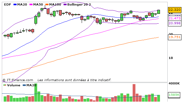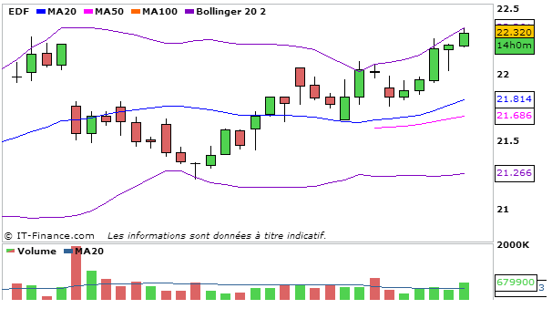 Pour EDF, en UT journalière, la MACD repart à la hausse et coupe légèrement à la hausse sa ligne de signal (0,188) et la stochastique repart à la hausse et coupe à la hausse sa ligne de signal (83,51). Graphiquement, le cours termine au dessus de la bande supérieure de bollinger.