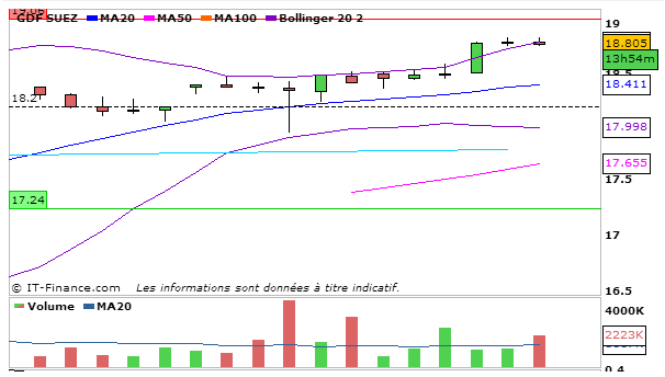 Pour GDF, en UT journalière, la MACD continue sa hausse au dessus de sa ligne de signal (0,544) et la stochastique continue de croître à 96,04 même si elle se confond avec sa ligne de signal. Le cours termine juste en dessous de la bande supérieure de bollinger. L’ADX croît légèrement à 29,58.