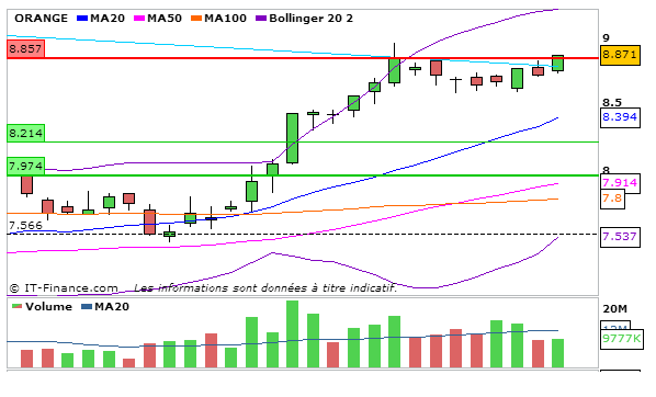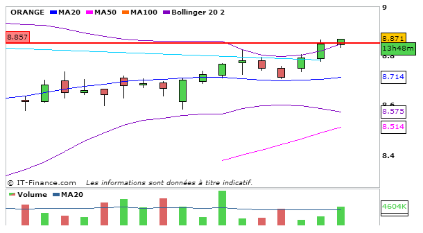 Concernant Orange, en UT journalière, la MACD est en légère hausse au dessus de sa ligne de signal à 0,276 et la stochastique repart légèrement à la hausse à 83,74 et a coupé sa ligne de signal à la hausse. Graphiquement le cours quitte progressivement la bande supérieure de bollinger en direction de la MM20 qui reste encore loin. L’ADX reste haussier à 44,06 ce qui traduit que la nouvelle tendance haussière est forte!