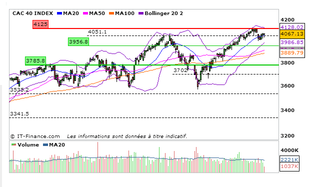 De la même manière que vendredi dernier, le CAC est allé chercher un plus bas de 4038 points pour finalement clôturer à 4067 points en légère baisse de 0,06 % par rapport à vendredi.