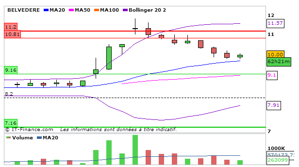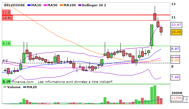 Concernant Belvédère, lourde consolidation de plus de 3% aujourd’hui. En UT journalière, la MACD poursuit sa hausse par rapport à la séance d’hier à 0,49 et évolue au dessus de sa ligne de signal. La Stochastique repart à la baisse en dessous de sa ligne de signal à 61,39. Graphiquement on termine en dessous de la bande supérieure de bollinger. L’ADX repart à la hausse à 38,46 ce qui signifie que la tendance haussière reste intacte. Attention à la volatilité qui s’est agrandie…Je reste extrêmement positif sur la valeur mais je n’exclus pas à court terme une nouvelle consolidation jusqu’à la MM20.