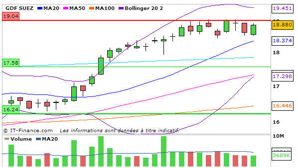 Concernant GDF, En UT journalière, la MACD baisse légèrement et coupe à la baisse sa ligne de signal (0,498) et la stochastique baisse légèrement en dessous de sa ligne de signal à 78,64. Le cours termine entre la bande supérieure de bollinger et la MM20. L’ADX baisse légèrement à 30,02.