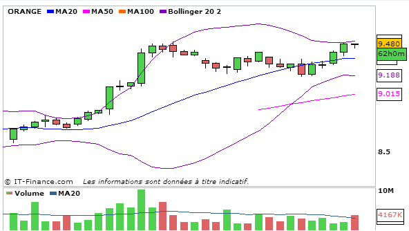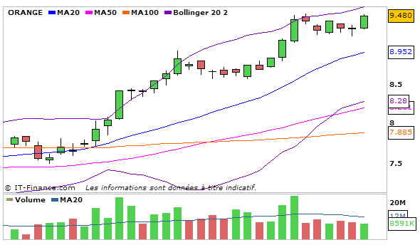 Concernant Orange, En UT journalière, la MACD est en légère augmentation en rebondissant au dessus de sa ligne de signal à 0,355 et la stochastique repart légèrement à la hausse à 83,73 et va couper à la hausse sa ligne de signal. Graphiquement le cours évolue en trade range entre la bande supérieure de bollinger et la MM20. L’ADX reste haussier à 52,07 ce qui traduit que la nouvelle tendance haussière est forte! Une figure en W ou tasse avec anse est en trainde se mettre en place.