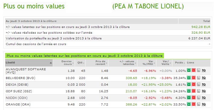 Mon portefeuille s’est moyennement comporté aujourd’hui puisque ORANGE et GDF auront progressé et BVD aura une nouvelle fois consolidé. Mes plus values latentes atteignent environ 940 € de plus value latente. Les plus values totales atteignent environ 1270 € soit un rendement d’environ 29 %.